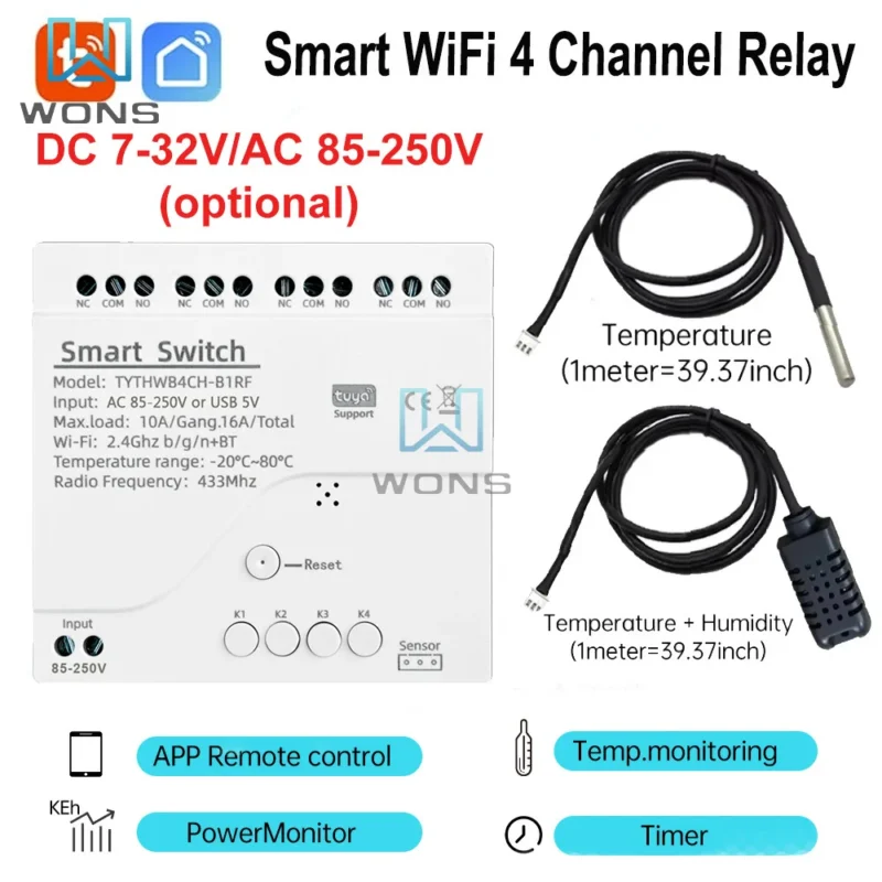 110V 220V Tuya Smart WiFi 4 Channel Relay With Temperature Humidity Sensor Passive Dry Contact Switch Alexa Alice Compatible