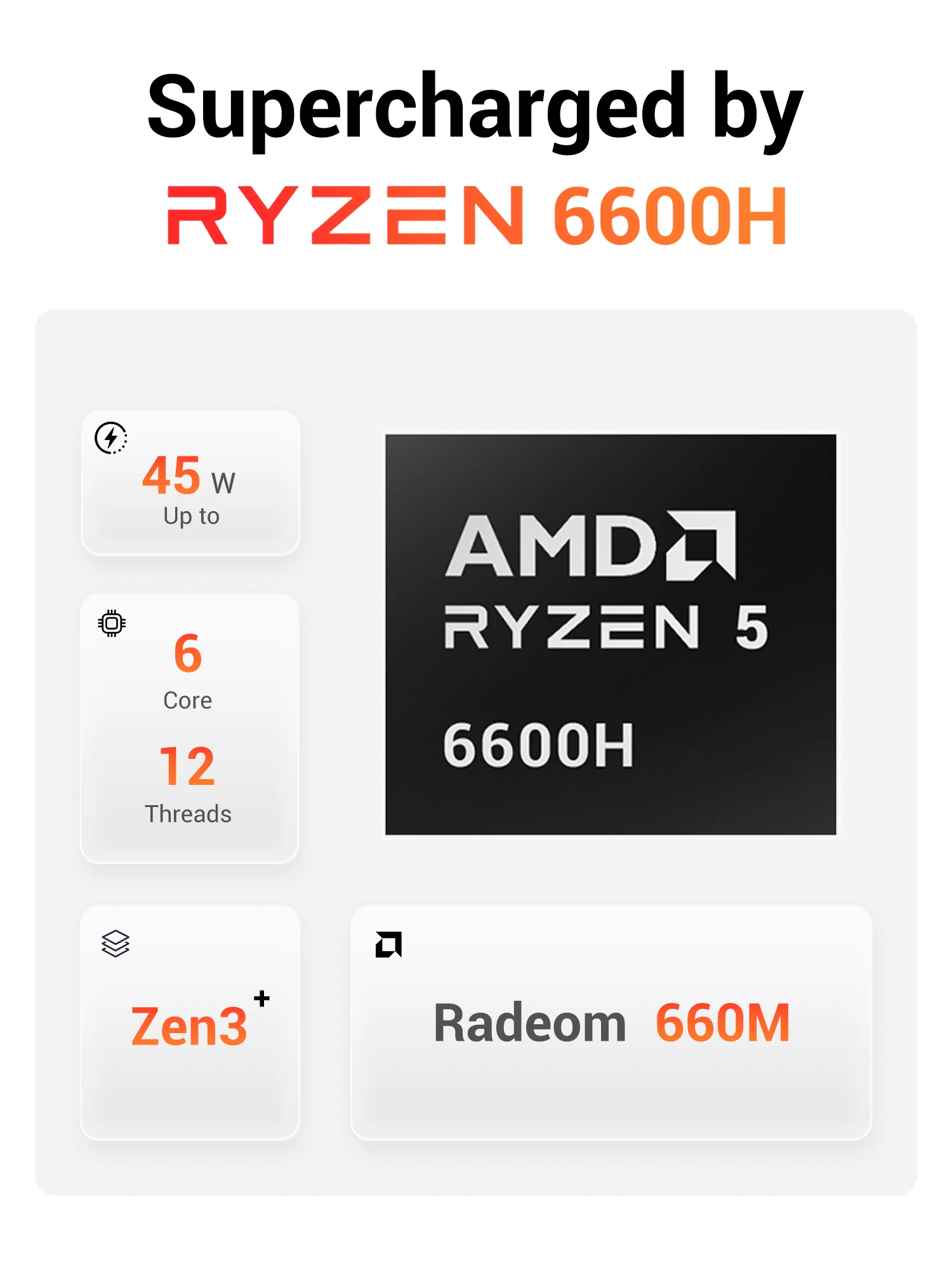 –Firebat AM02 mini pc equips with 6-core/12-thread AMD Ryzen 5 6600H, thanks to the significant improvements of the Zen 3 architecture, the 6600H delivers substantial gains in both office smoothness and productivity performance.