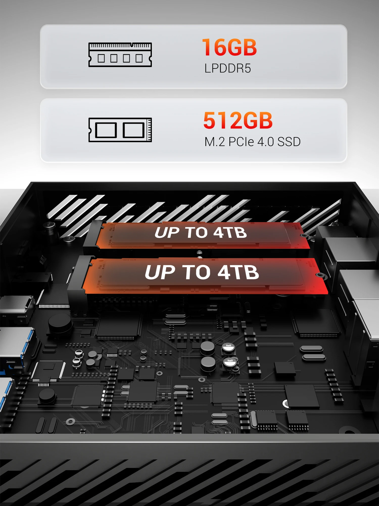 –Pre-installed with 16GB of high-capacity LPDDR5 memory, delivering higher frequencies and smoother multitasking performance. 512GB of massive storage space meets all your daily storage needs. Equipped with dual M.2 SSD slots, supporting future storage expansion up to 8TB.