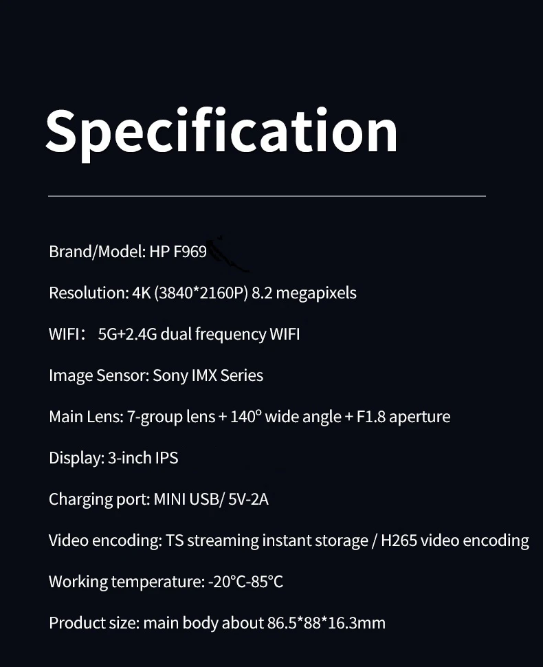 【HP F969】The HP F969 dashcam is equipped with a 140° ultra-wide-angle camera, providing comprehensive recording of your driving footage. With 4K+1080P dual-camera ultra-high-definition quality, it accurately captures every detail of the driving process, providing reliable evidence for accident disputes. The HP F969 dashcam is equipped with a 140° ultra-wide-angle camera, providing comprehensive coverage of the vehicle’s field of view. Main lens: 7-element lens + 140° wide-angle + F1.8 aperture The HP F969W and HP F969X are both part of the HP F969 series, differing only in production batches, with identical functionality and resolution.