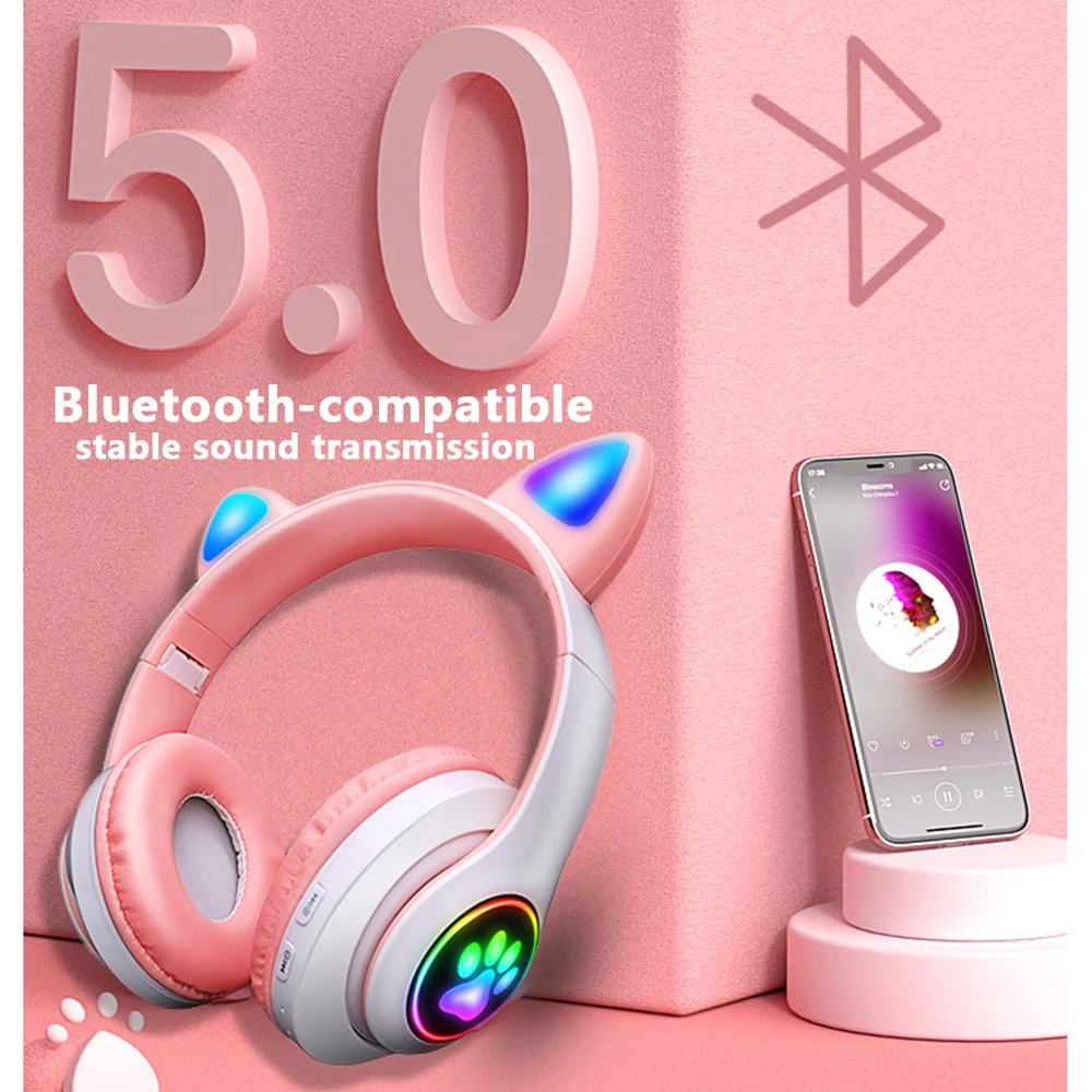 Pink Cute Cat Ears Wireless Headphone Bluetooth-compatible Headset Stereo Foldable Earphone with Microphone Music Kid Girl Gift