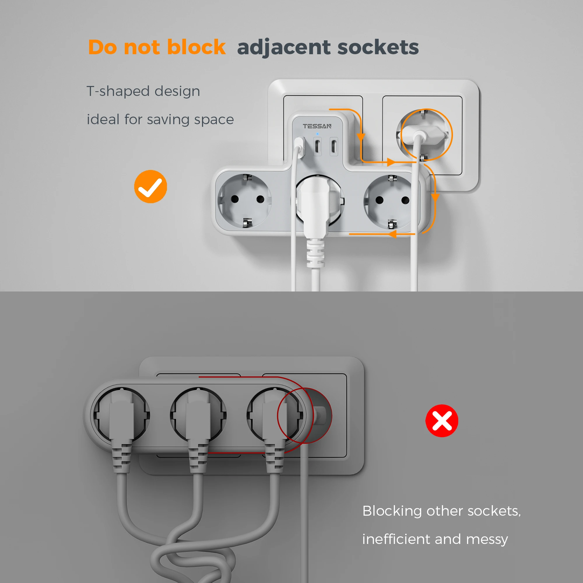 tessan power strip charges multiple devices at the same time, and the 3 parallel sockets will not tangle the lines, multiple socket base does not take up desk space and is easy to organize.