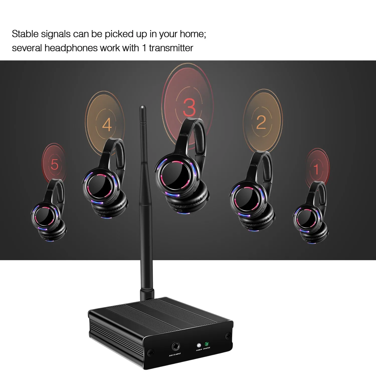 * Connect transmitter to whatever you want to listen to (i.e iPod, DJ, Xbox, TV), suitable for any audio device with 3.5mm jack audio output or RCA output.